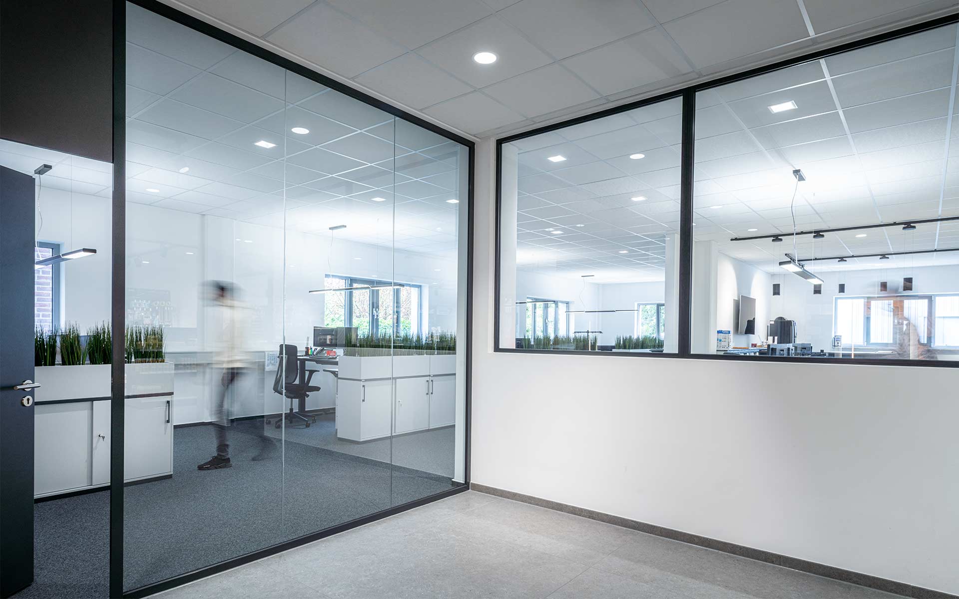 Energy-efficient workplace lighting: the consistently high colour rendering index of Ra >90, very good glare limitation and light control with collimator technology ensure high quality light at the workplace.