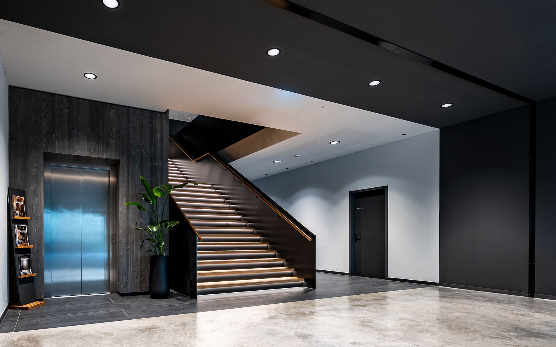 Sonnos downlights structure corridors and hallways. The 80° extra wide beam angle (extreme wide flood) enables maximum spacing between the light points. A semi-specular diffuser illuminates floor surfaces softly and without glare.