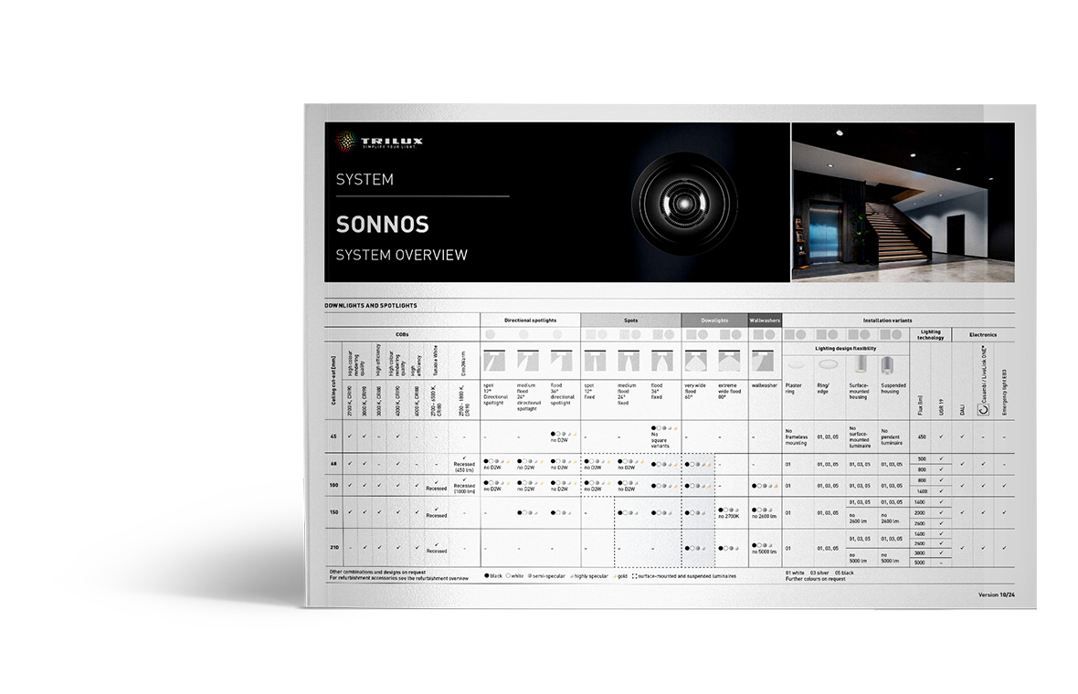 Whether directional spotlights for installation in ceilings or track, decorative pendant luminaires or compact downlights for wall recesses - Sonnos offers versatile options for the accent lighting of walls, tables and counters. With consistent lighting technology and uniform design.