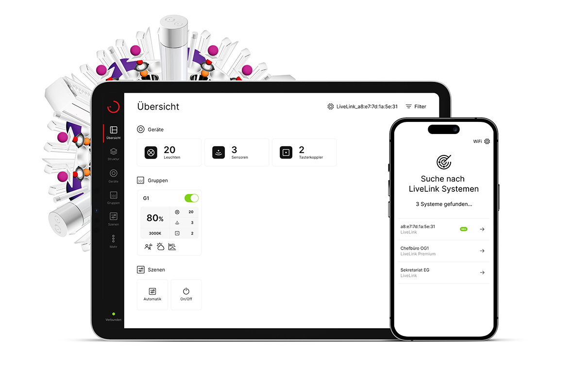 Optimal lighting, minimal energy consumption - lighting management with LiveLink enables intelligent control of even complex lighting installations and reduces energy consumption by up to 85%.