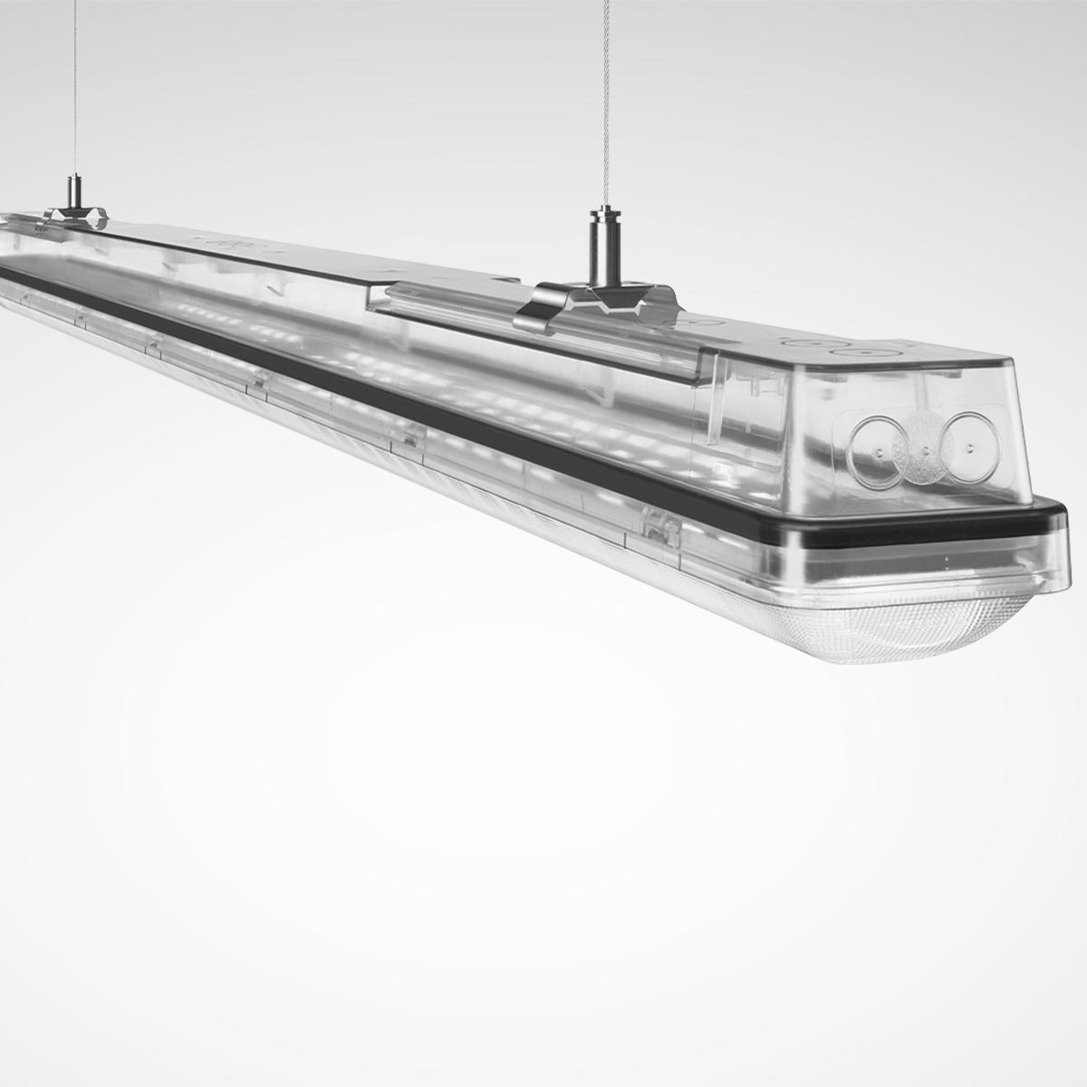 The Tugra combines a high protection rating with an equally high aesthetic standard: with its cylindrical design and characteristic end caps, the Tugra brings a new level of design to demanding applications such as parking garages, warehouses and production facilities. Particularly attractive: the Tugra as a light line. The modern luminaire design enhances functional industrial architecture as well as modern new-work areas.