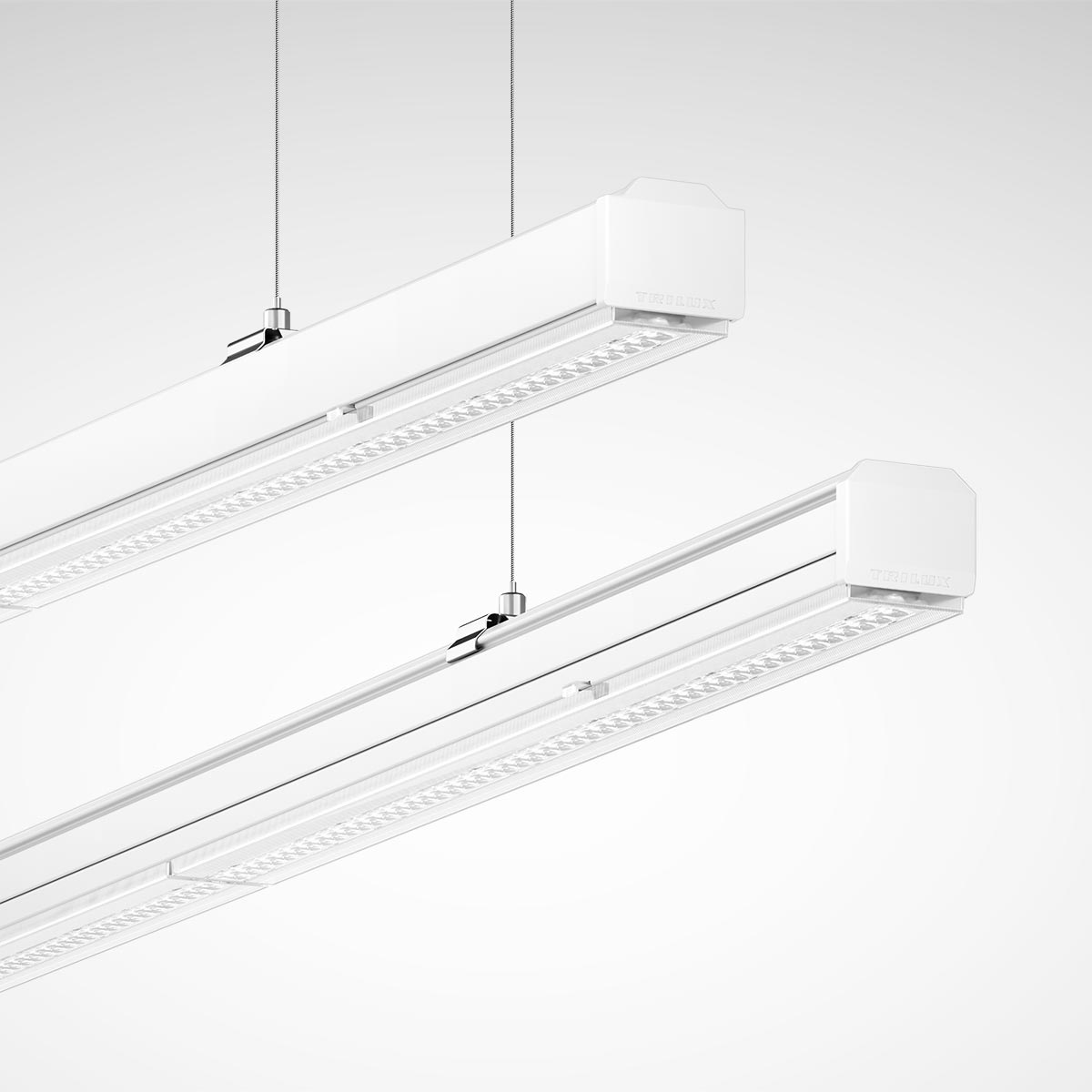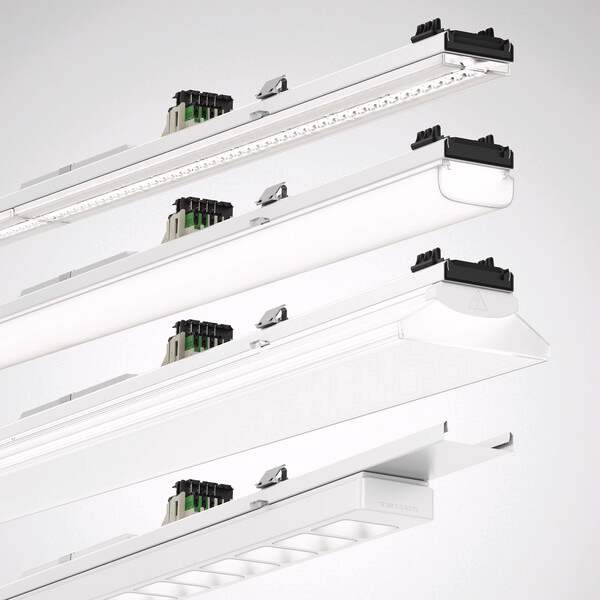 The TRILUX continuous line system with new trunking is now even better: the gear trays can be freely positioned in the future-proof current routing. The even more simplified mounting saves additional time - and is still tool-free, just like disassembly. What remains is the proven, modular kit system of E-Line luminaire inserts, which can be adapted to any application thanks to a unique bandwidth of variants.