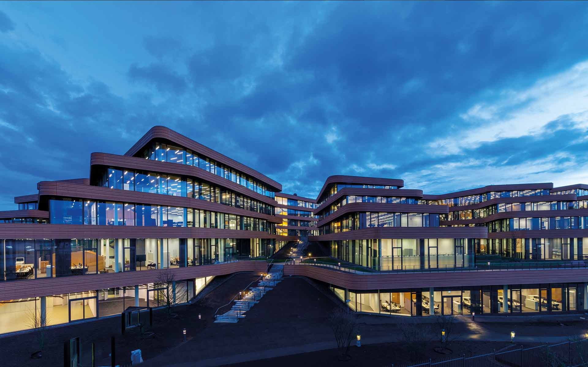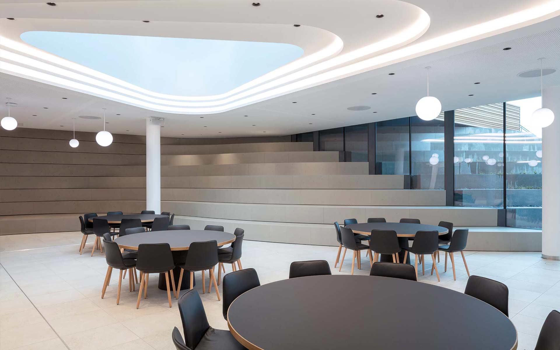 The new headquarters of a large German company blends in perfectly with its rural surroundings. The terraced complex comprising a total of five buildings accommodates offices for 1,500 employees, including a canteen, fitness area, kindergarten etc. - and was predominantly equipped with TRILUX luminaires. A mix of the standard portfolio and customized special solutions were used. What they all have in common is the unique design language and excellent quality of light.