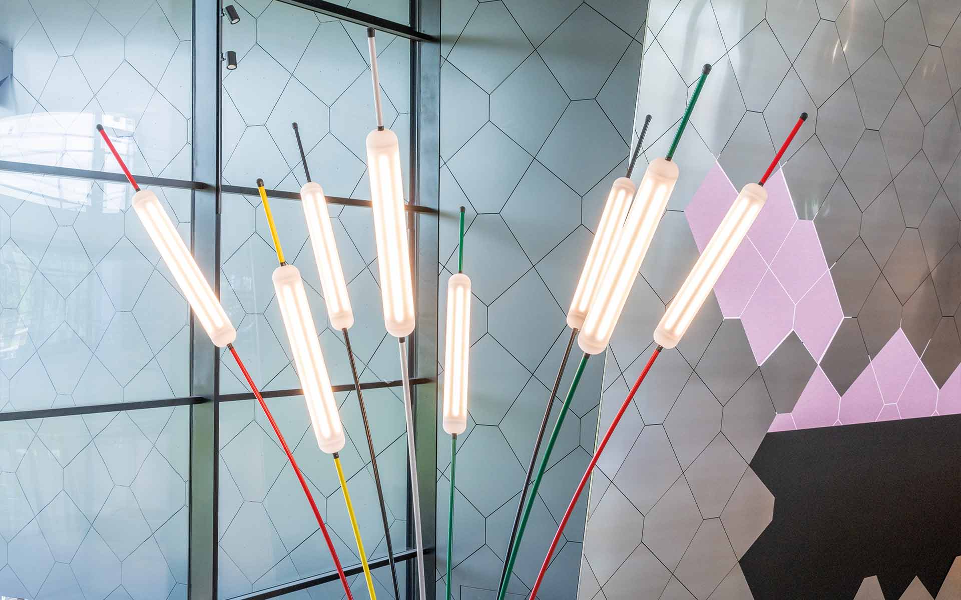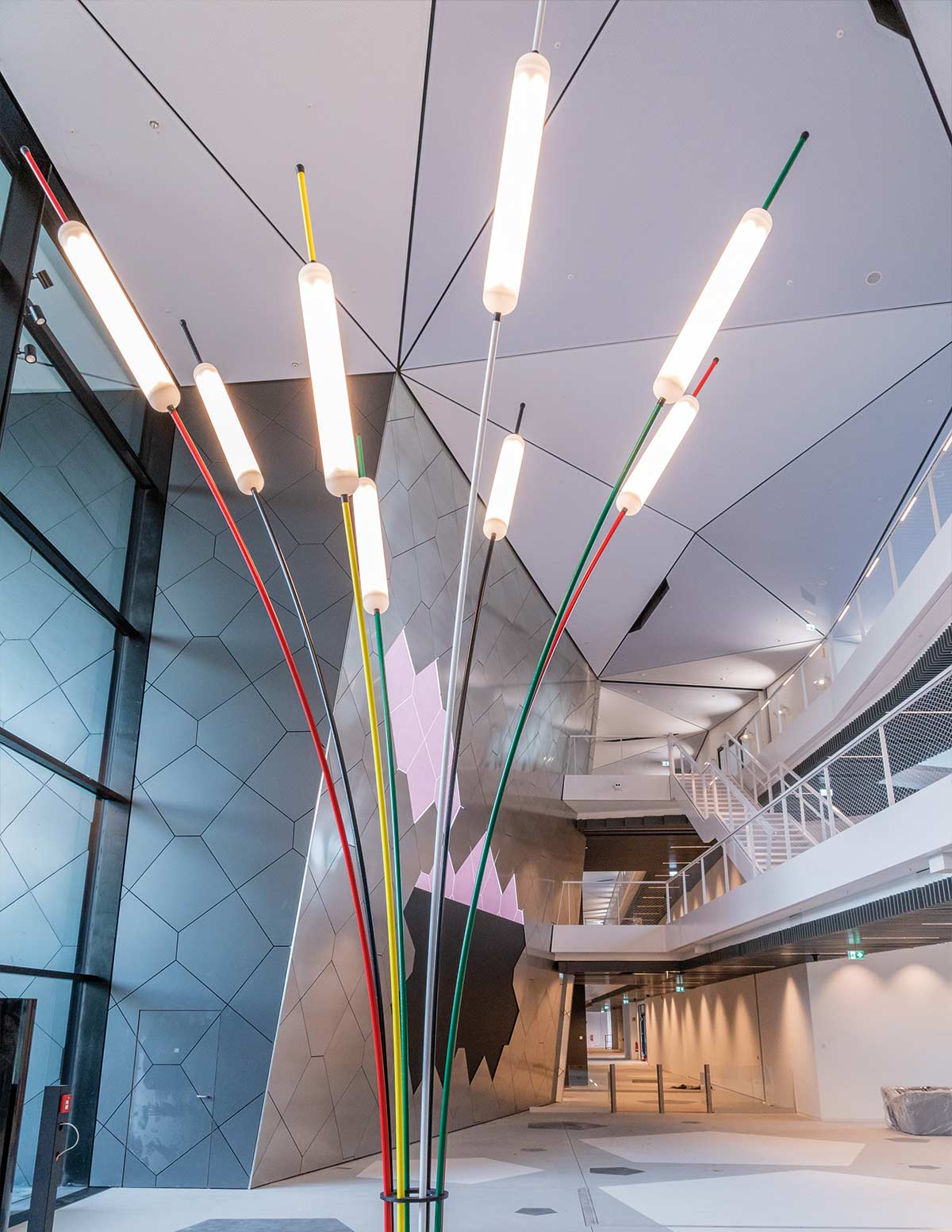 A unique work of art, created in our Arnsberg factory, now stands in the foyer of the DFB headquarters in Frankfurt am Main. The eight-meter-high light sculpture was made from pole vault poles. The illuminated pistons are made of satinized plastic. One hurdle was the statics of the artwork, but our experts were able to solve this without any problems.