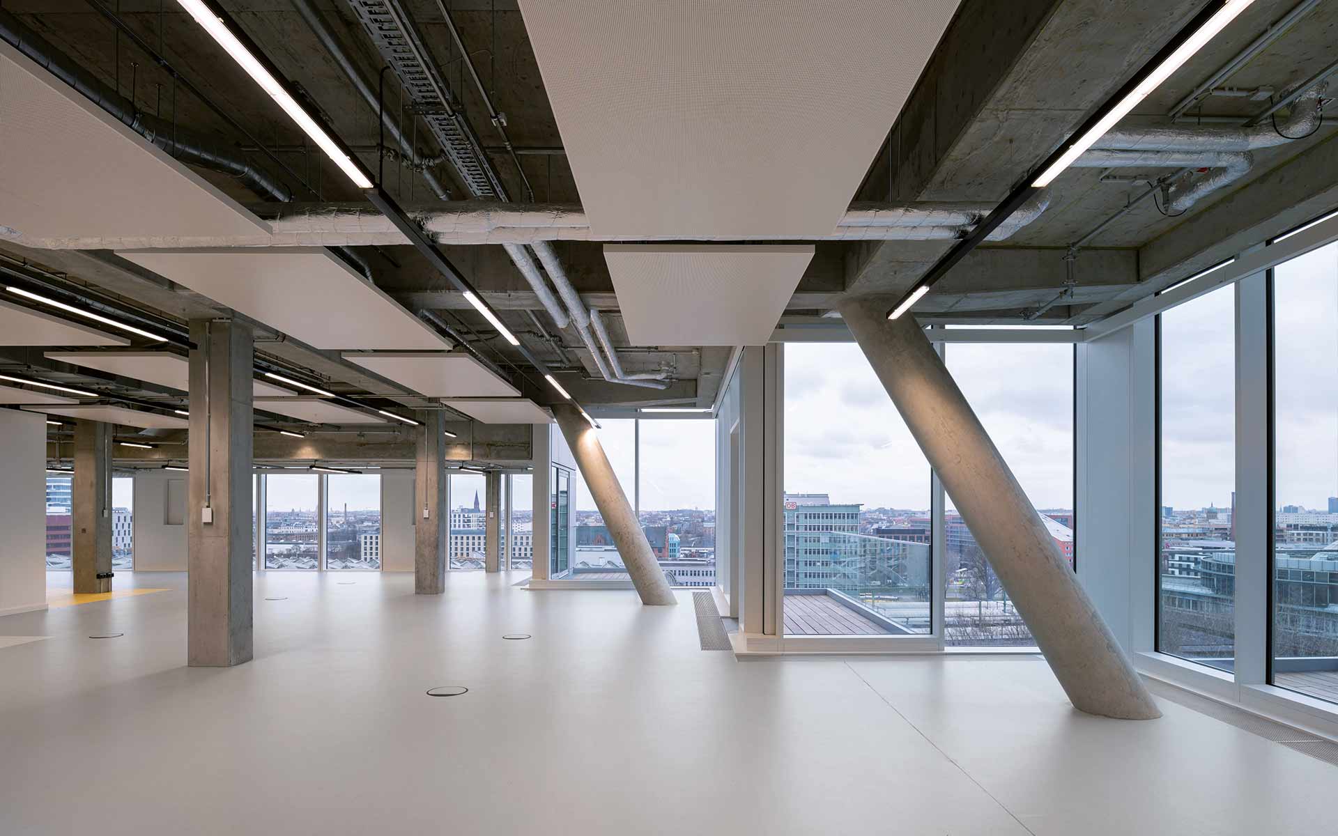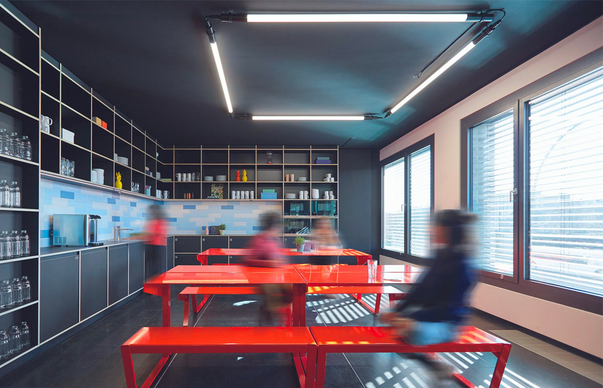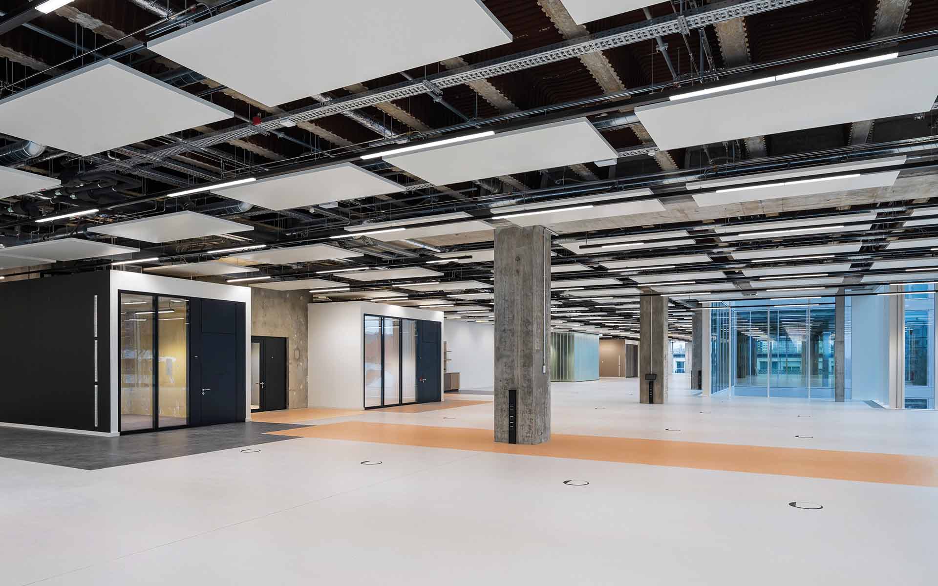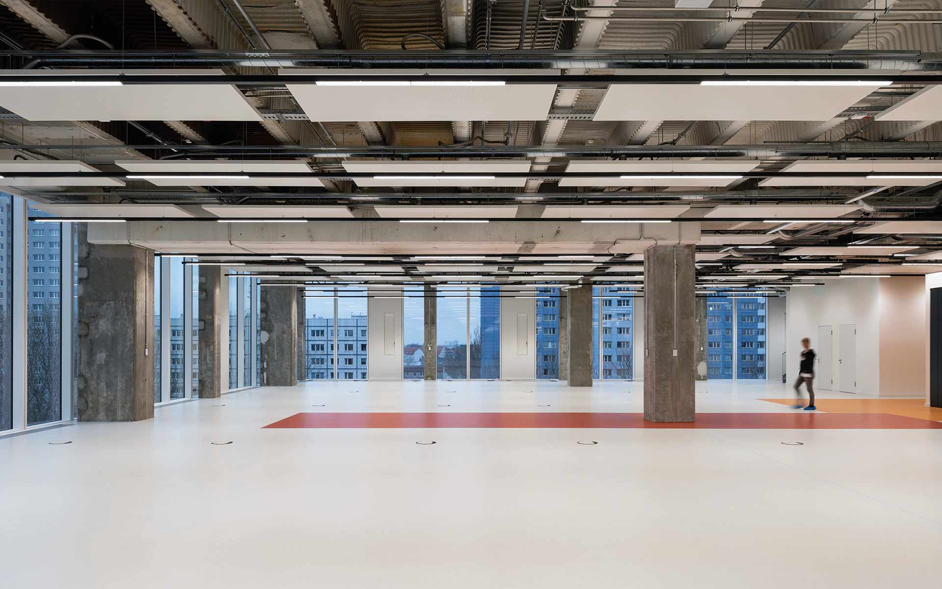 The radical architectural conversion of the historic GDR department store in Berlin Friedrichshain does not deny its roots: the interplay of open concrete surfaces and a cutting-edge interior creates contemporary working spaces and office lofts. A unifying element that runs through the entire building, blends in perfectly with the sophisticated architecture and provides perfect light everywhere: the modular E-Line NEXT continuous-row lighting system in black.
