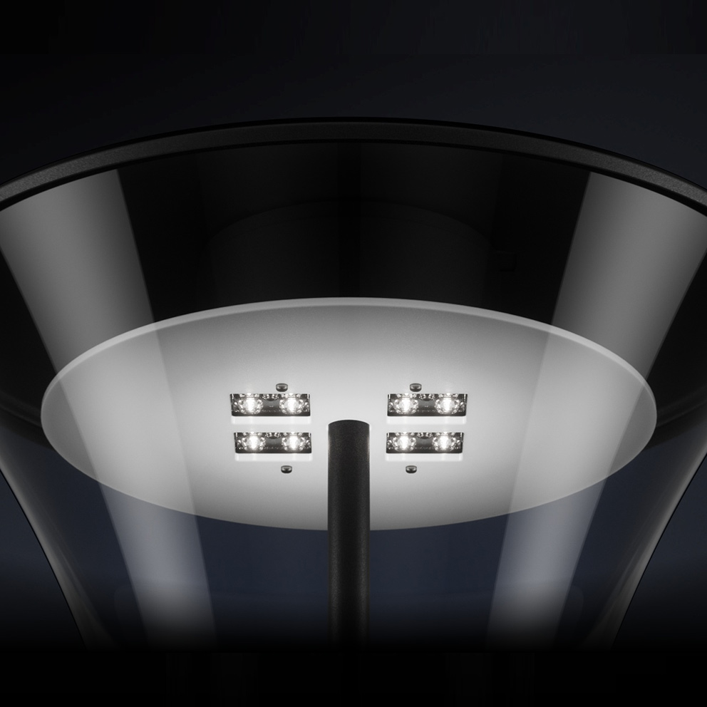 For this purpose, light components of the LEDs are directed via the primary optic into a light-conducting plate in the optical system. This luminous surface reduces the contrast between the LED light points and the adjacent areas – thus achieving particularly pleasant light with reduced glare.