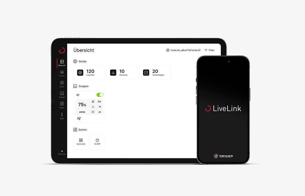 Integrate an E-Line Pro system into a light management system? Nothing could be easier: use the DALI cables in the power supply of the trunking intended for this purpose to control DALI-capable luminaires. Alternative: Control wirelessly via Bluetooth LE, for example with LiveLink Retail. TRILUX light management reduces energy consumption and increases ease of use. It enables HCL lighting concepts and offers interfaces for monitoring, remote maintenance and integration into the building management technology.