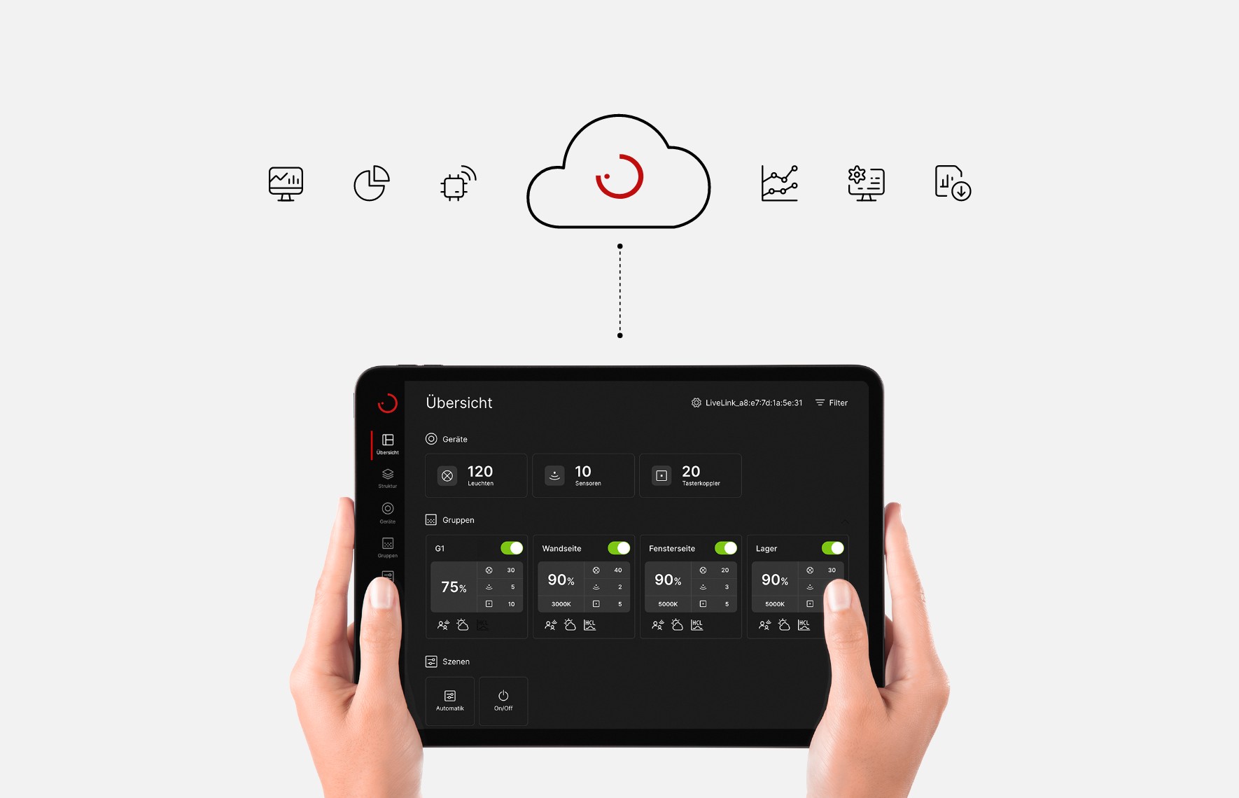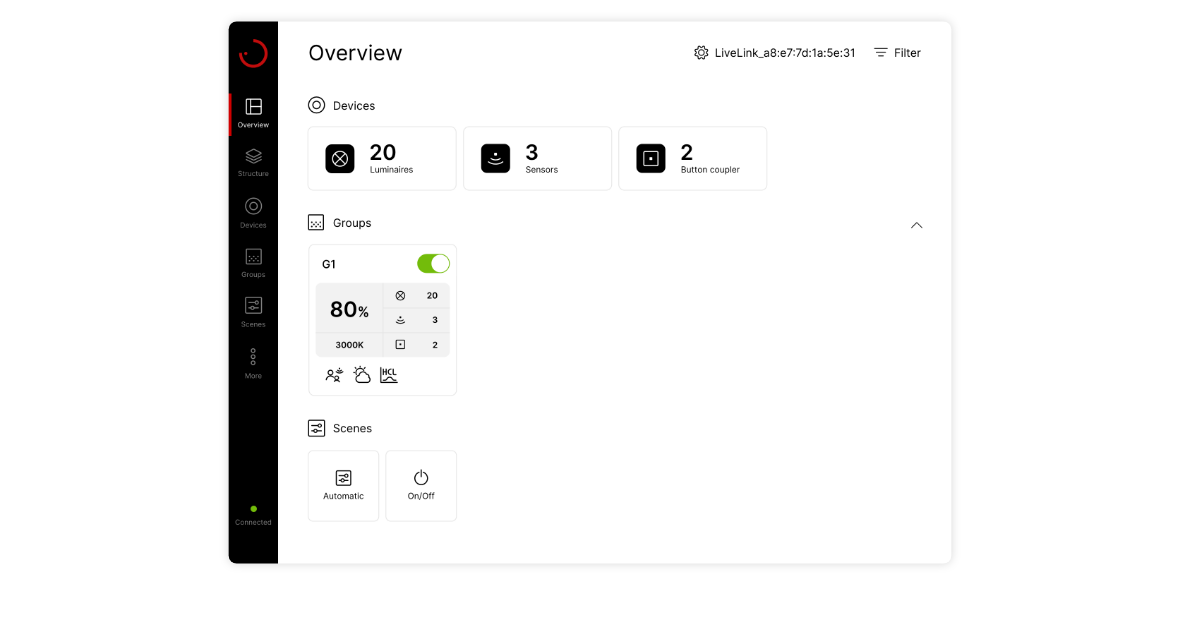 Plug & play with LiveLink WiFi and LiveLink LAN DR – all system devices are recognised automatically, sensor functions are preconfigured and connected push-buttons enable the lighting to be switched and dimmed.