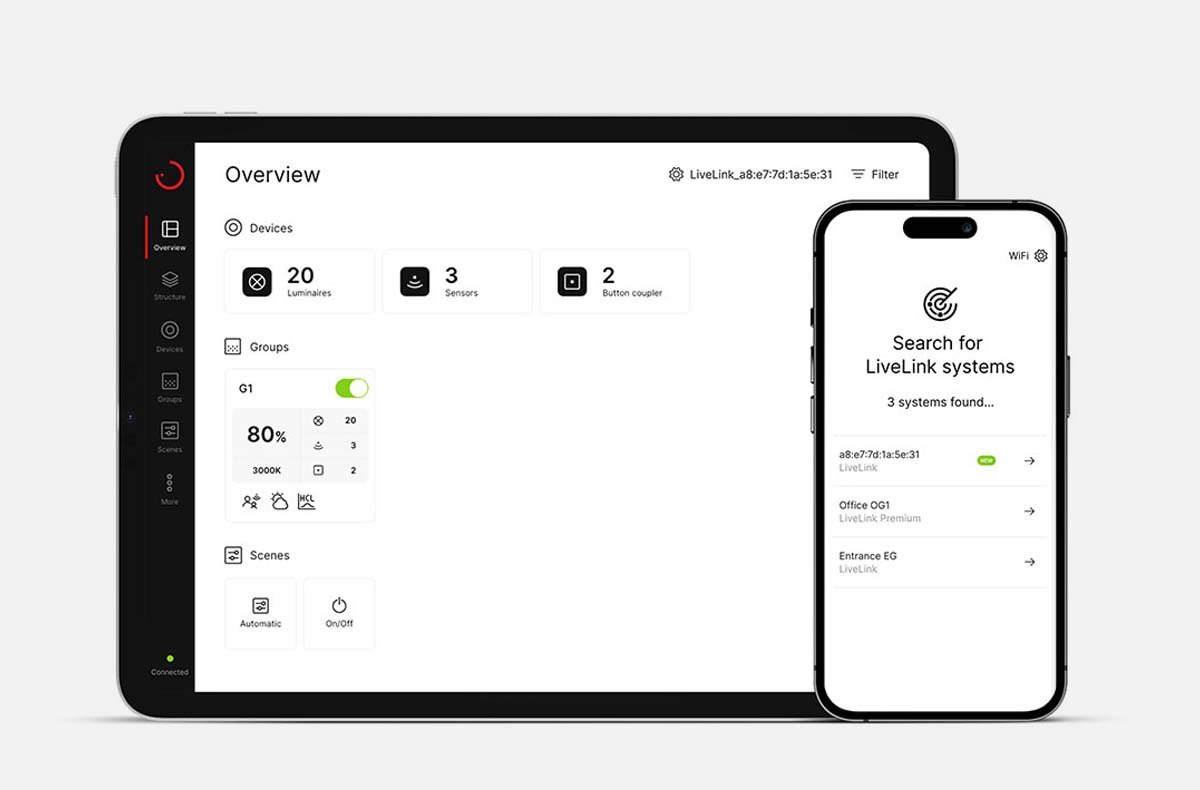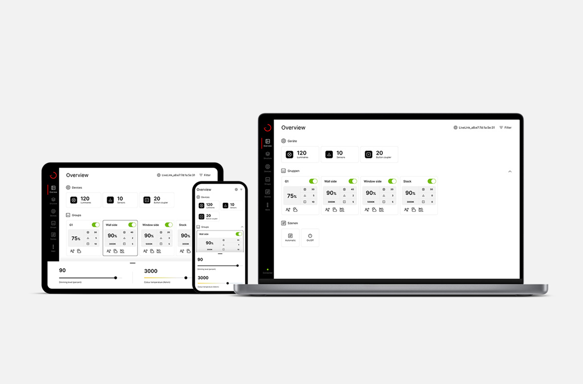 With the new LiveLink ONE app, you can control DALI-based lighting systems with a single app and benefit from intelligent functions for energy-efficient light management. Clever features for commissioning and configuration support you with any size of project.