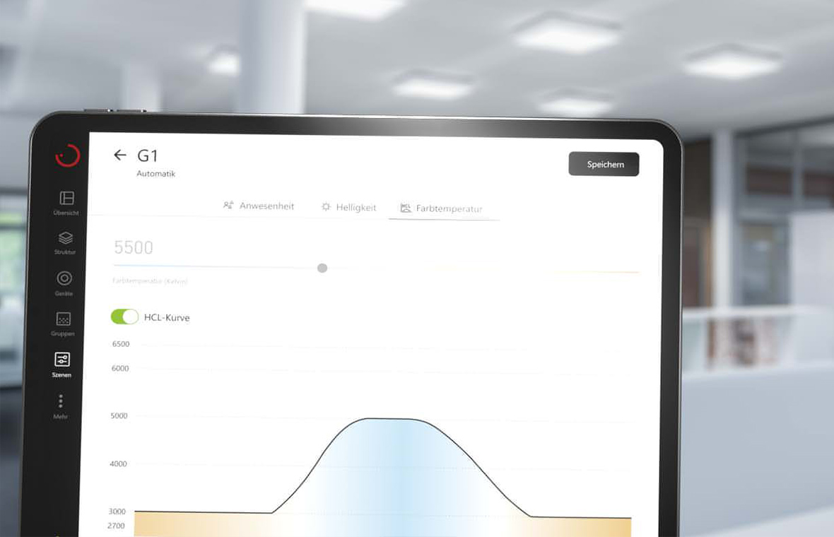 The HCL (Human Centric Lighting) function dynamically controls the brightness and colour temperature of the light, based on the natural course of daylight. Either use a predefined TRILUX HCL curve or define your own curve (from autumn 2025).