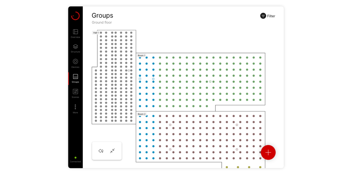 Create or import building structures and filter according to groups or scenes for specific building areas. The building structure allows even extensive installations to be clearly and simply visualised. Filter functions by building, floor or room make navigation easier and ensure maximum transparency with groups and scenes.
